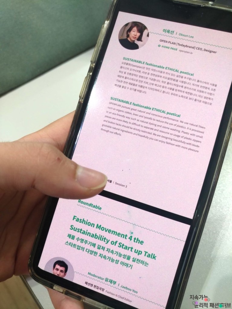 The session I participated in was this. Under the initiative of Yoo Jae Bu, editor in chief in Fashion N, 5 Korean brands, including OPEN PLAN, addressed their respective practices and efforts, and discussed them with Amy Hall and Tara St. James. Under the theme of “Fashion for Art and the Public” Lee Sung Dong, Ul:kin’s creative director, delivered a speech. Choi Yi Hyun, CEO of Continew, spoke on “New from the end”, Park Ju Young, a designer of Fair Trade Korea, said “The Future of Handcrafts”, and Park Joong Yeoul, CEO of Jerry Bag, spoke on the topic of “Local and Social Value for Sustainability.”